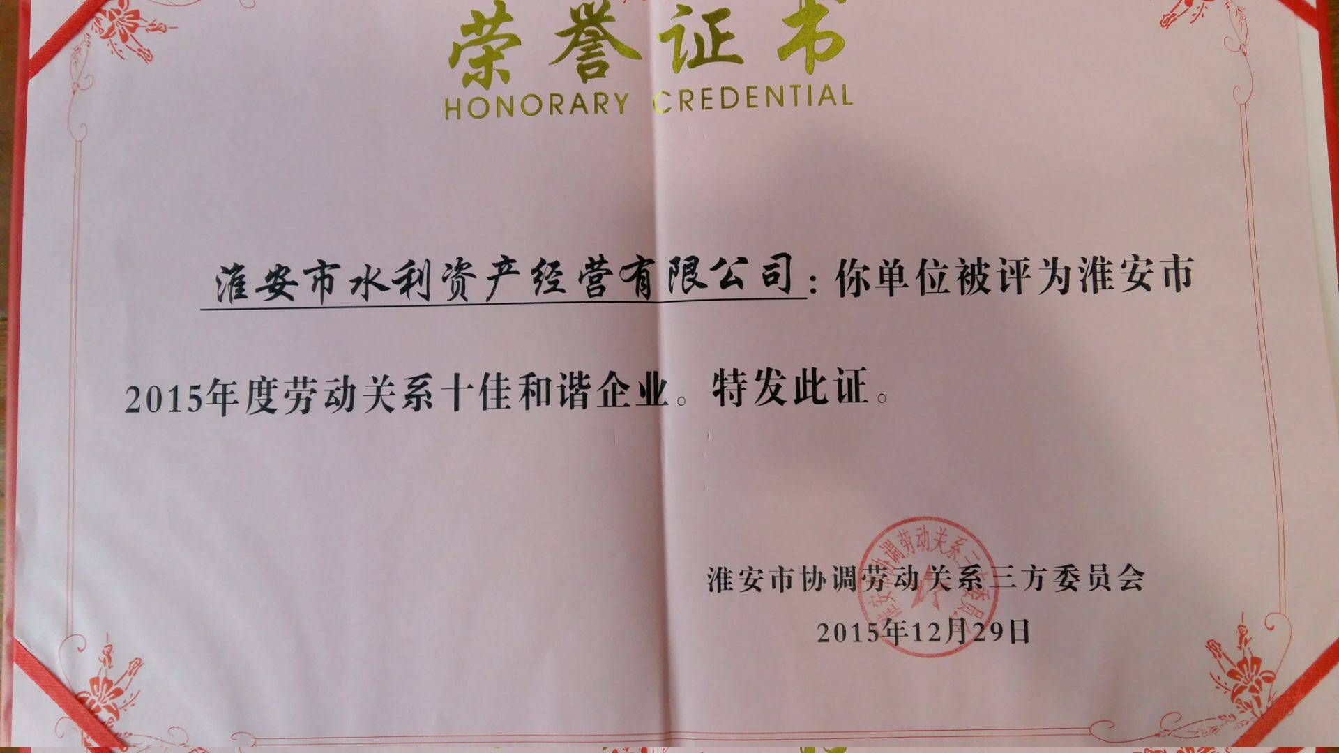 2015年度勞動關系十佳和諧企業(yè)